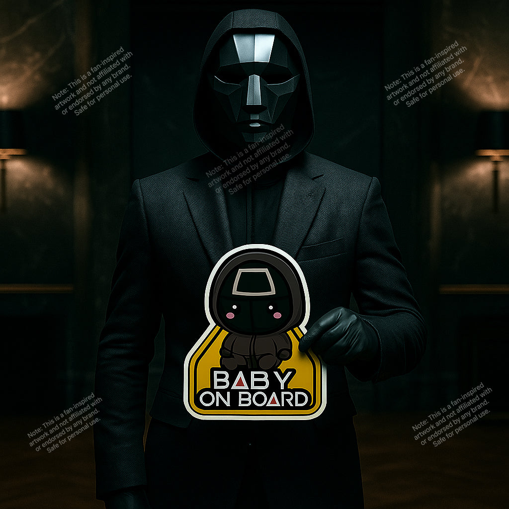 Add a bold touch of fun to your car with this high-quality “Baby On Board” vinyl sticker featuring an adorable baby version of The Front Man from the viral hit Squid Game. Designed in a sleek black hoodie with blushing cheeks and the signature square mask, this sticker is both eye-catching and conversation-starting!