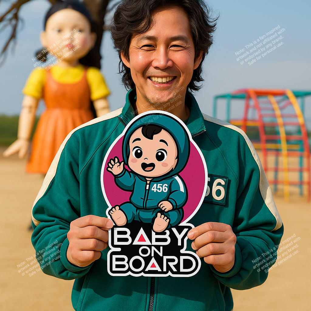 This “Baby On Board” car sticker features an irresistibly cute baby dressed as Player 456 from the hit TV series Squid Game. Dressed in the iconic green tracksuit with the number 456, this bold yet playful design will turn heads while reminding others that your precious little player is on board.
