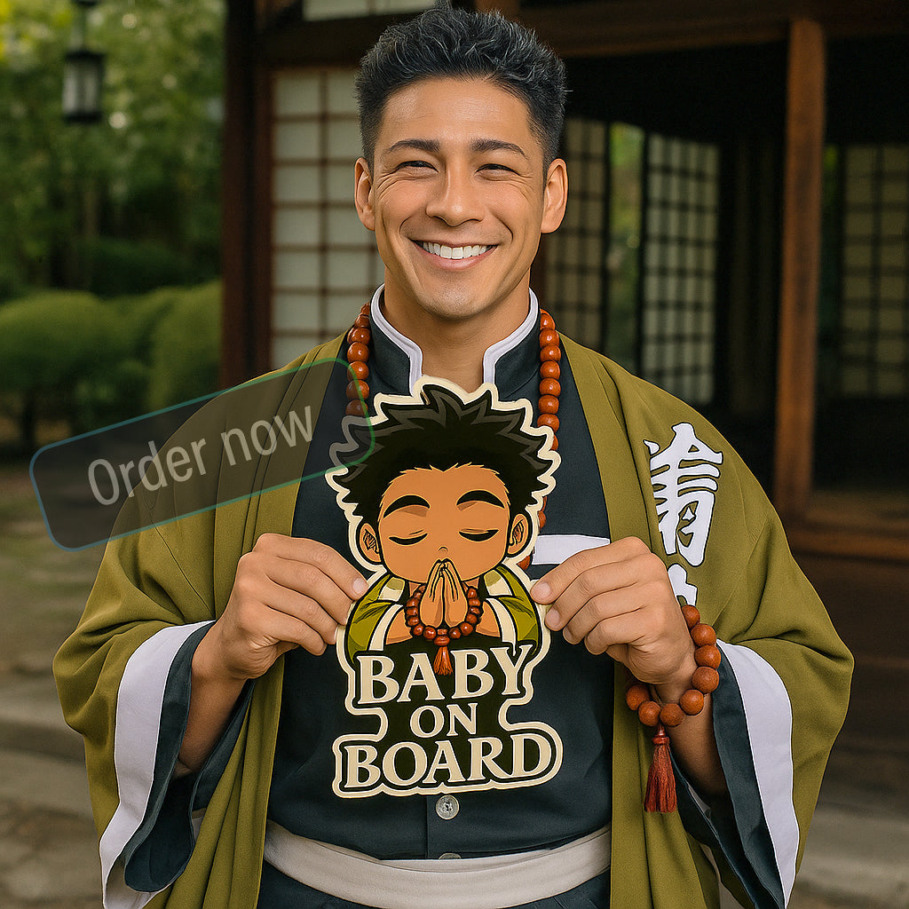 Balance safety and serenity with this peaceful yet eye-catching “Baby On Board” car sticker featuring baby Gyōmei Himejima, the Stone Hashira from Demon Slayer! With his signature prayer beads, calm expression, and gentle aura, this chibi Gyōmei brings a sense of strength and sweetness to every ride.