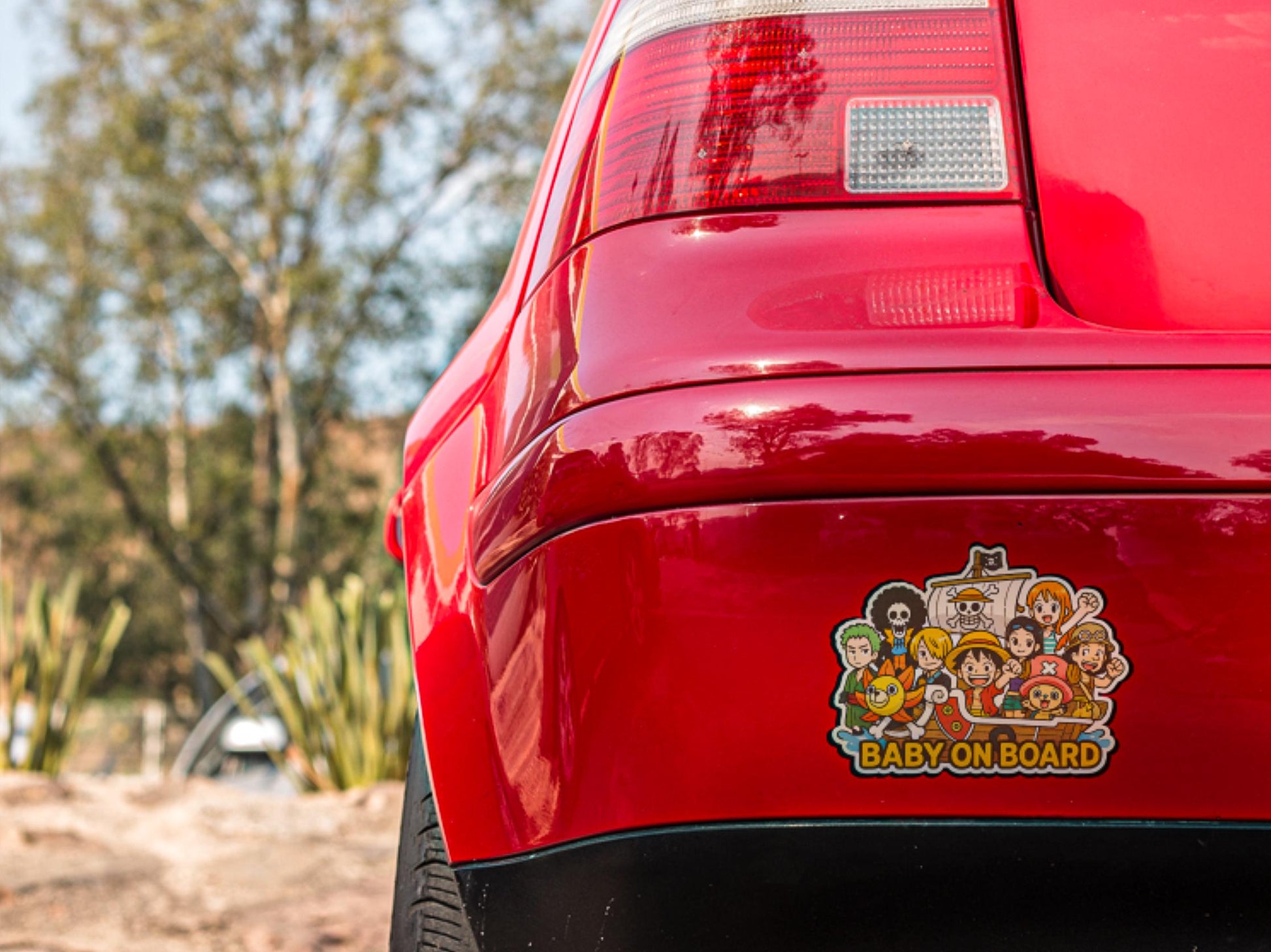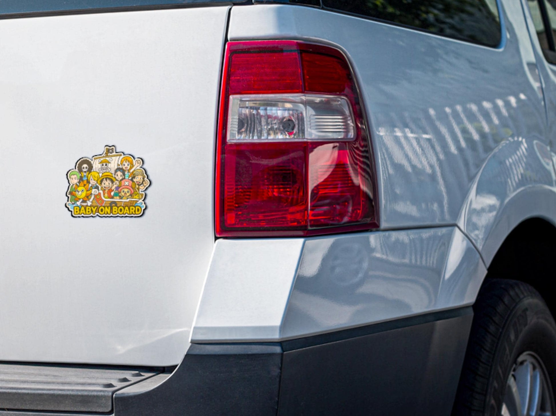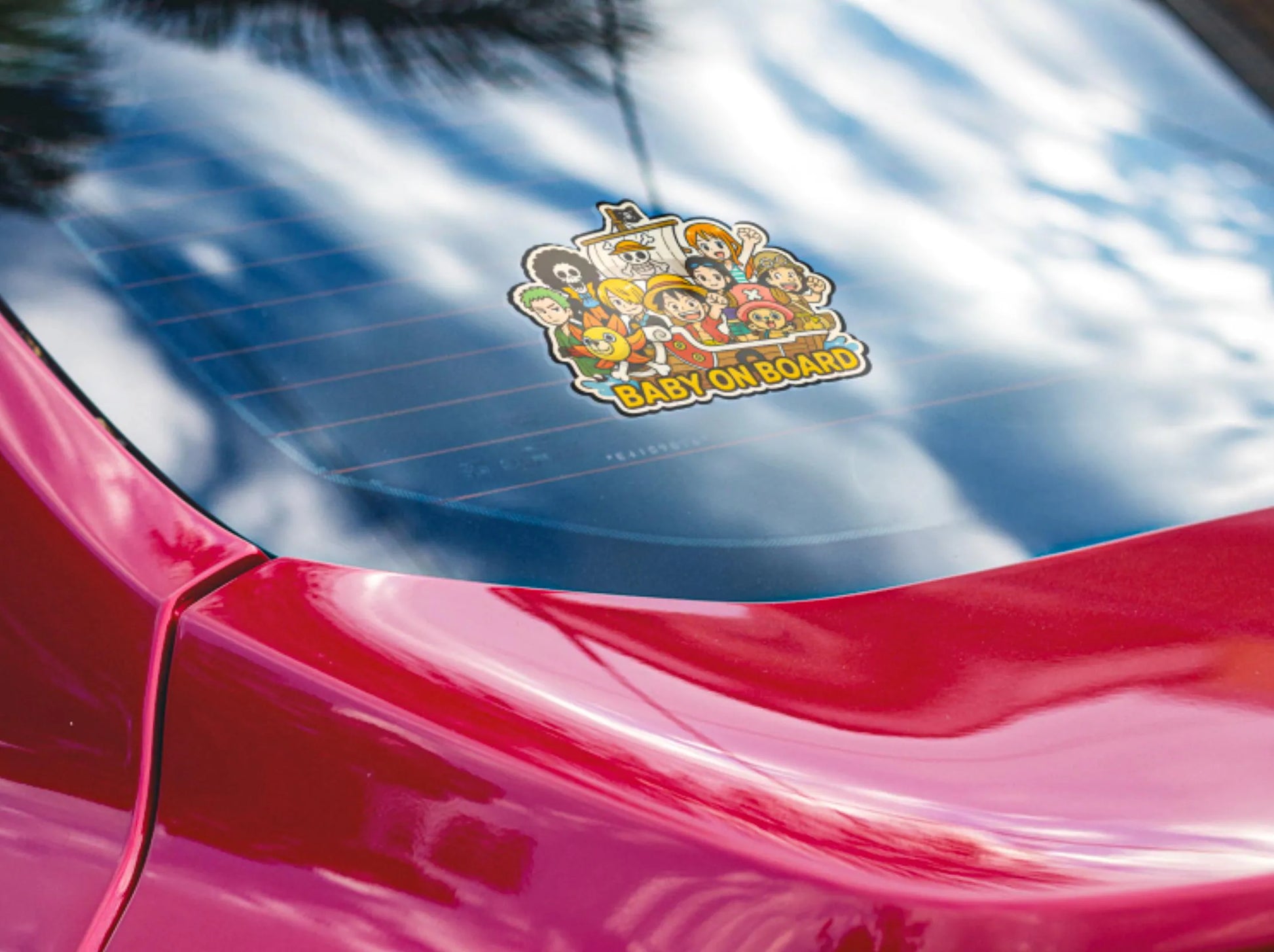 β Set sail with cuteness and safety! This βBaby On Boardβ car sticker features the entire Straw Hat pirate crew as adorable babies riding their iconic ship, the Thousand Sunny, from One Piece. Bright, playful, and perfect for anime-loving parents who want to make safety signs fun and fandom-friendly!